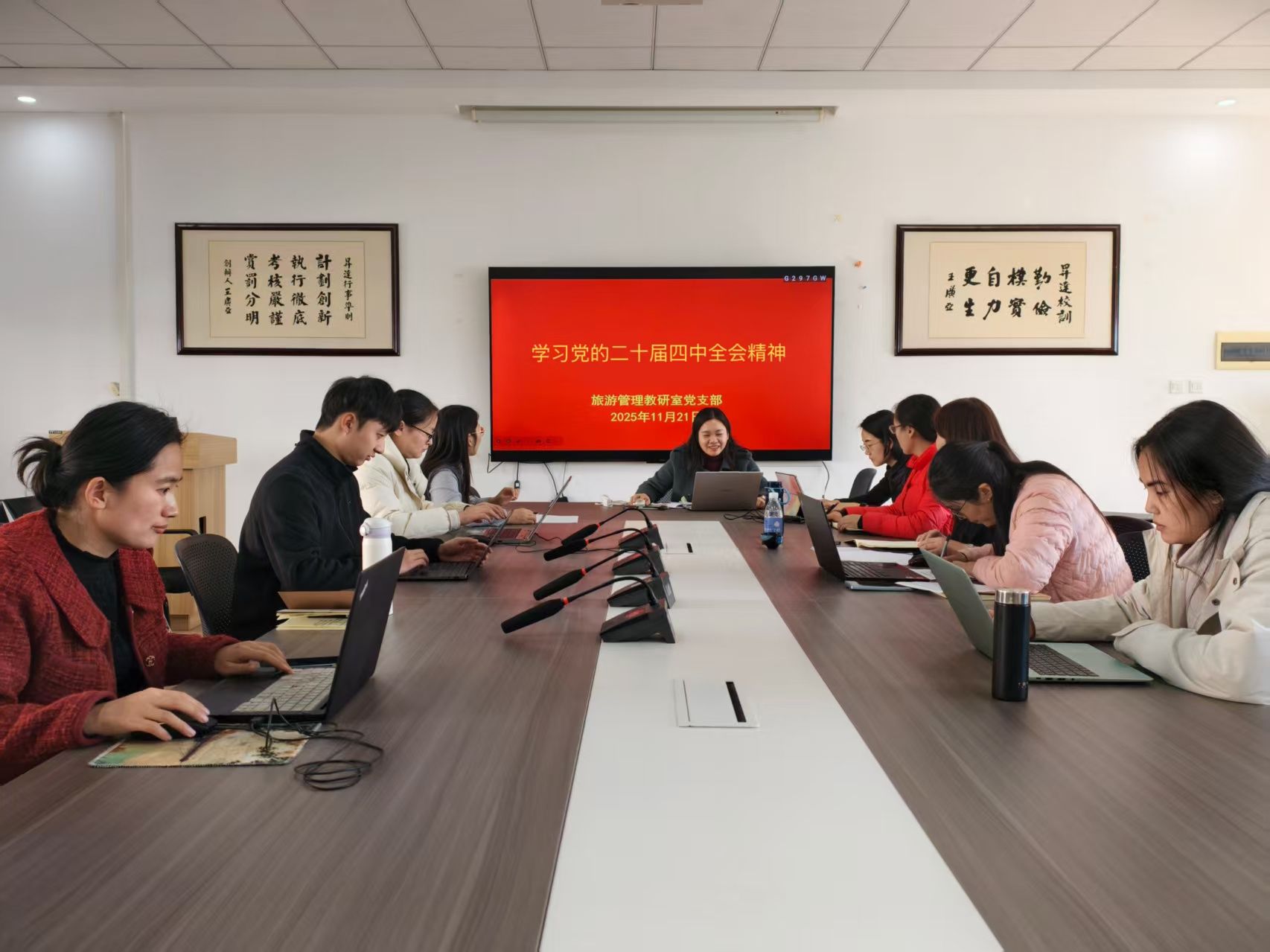 为深入学习贯彻党的二十届四中全会精神,将改革发展要求与旅游管理专业公司产品工作深度融合,旅游管理教研室党支部于2025年11月21日在2号楼205教室,组织教研室全体党员教师开展“学习党的二十届四中全会精神”专题学习研讨活动。活动由教研室主任梁淑芬同志主持,参会教师结合学科特色与岗位职责,共同探讨全会精神引领下的专业建设新路径。