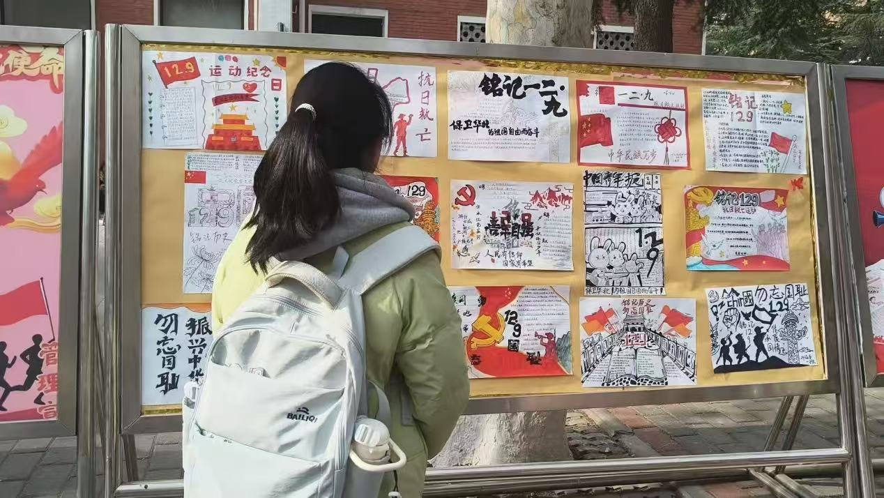 驻足凝望,一幅幅作品生动呈现在展板上:有的重现北平学子振臂高呼的壮烈场景,带人重回那段热血沸腾的岁月;有的深入诠释爱国救亡精神在新时代的传承,展现青年一代的使命接续;也有的直抒胸臆,表达新时代青年的报国之志与赤子情怀。作品主题鲜明,充分体现思想性、艺术性与创造性的有机统一。