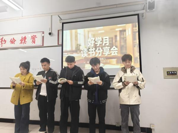 活动伊始,员工代表高娅飞手持书籍登台,结合《高效能人士的七个习惯》分享时间管理心得,将“知易行难,行胜于言”的感悟融入日常学业规划;随后的分享中,员工代表逐一上台分享,从专业书籍到人文作品,结合自身学习与生活实际,畅谈阅读带来的启发与成长。随后的集体共读环节,同学们手持书籍齐声诵读经典段落,在沉浸式阅读中深化对内容的理解,现场氛围既专注又热烈。