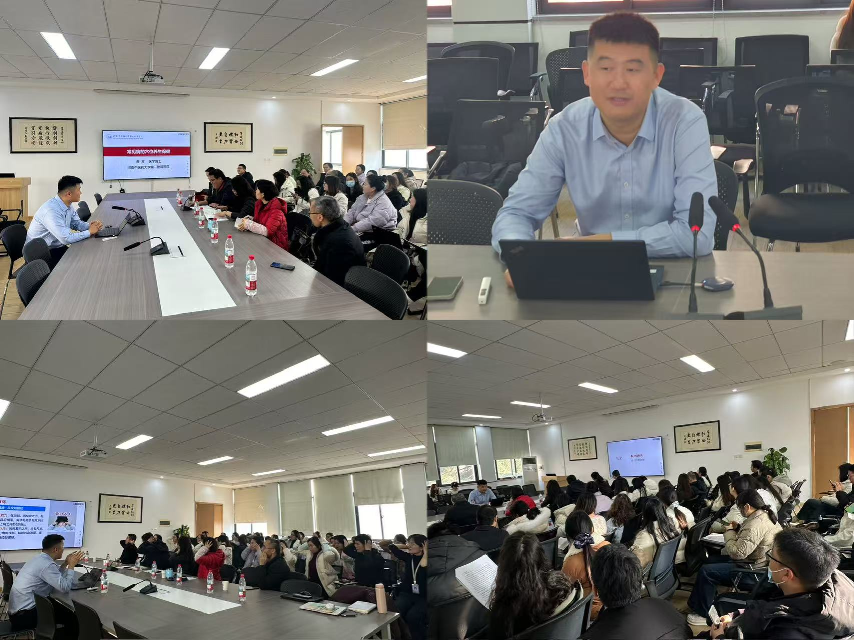 讲座中,曹方博士结合临床经验,针对颈椎病、偏头痛、腰椎病、失眠等教职工群体高发的健康问题,从中医经络理论出发,深入浅出地讲解了穴位定位、按摩手法及日常保健要点。例如,针对长期伏案工作引发的颈椎不适,曹博士现场演示了“风池穴”“肩井穴”的按摩技巧,并带领教职工练习颈部放松动作。教职工们积极互动,现场气氛十分活跃。讲座结束后,部分教职工围绕个体健康问题与曹博士展开深入交流。
