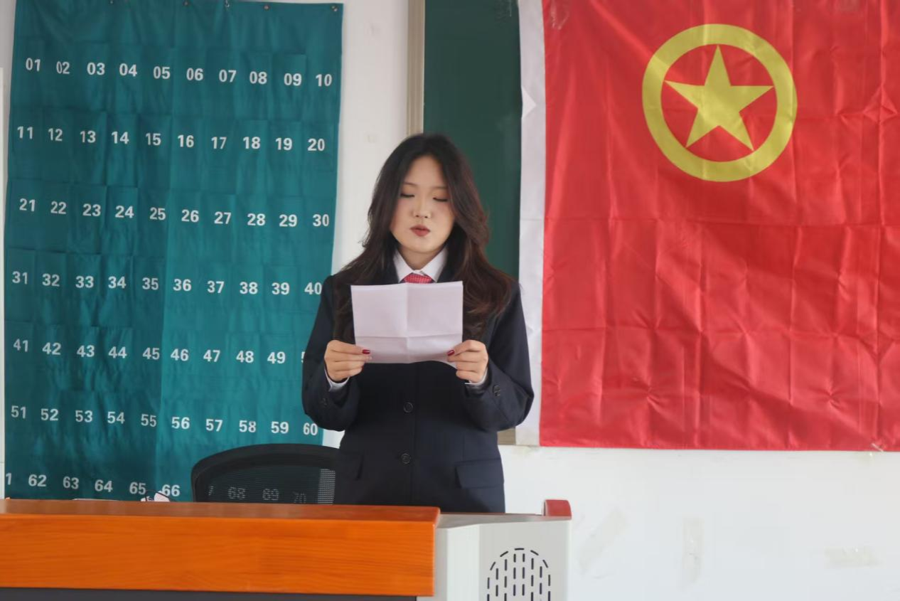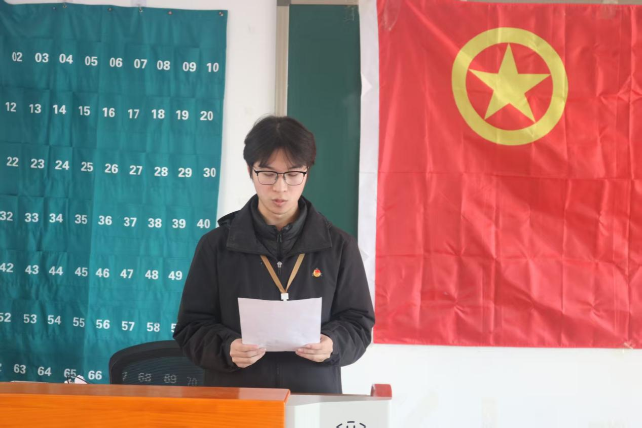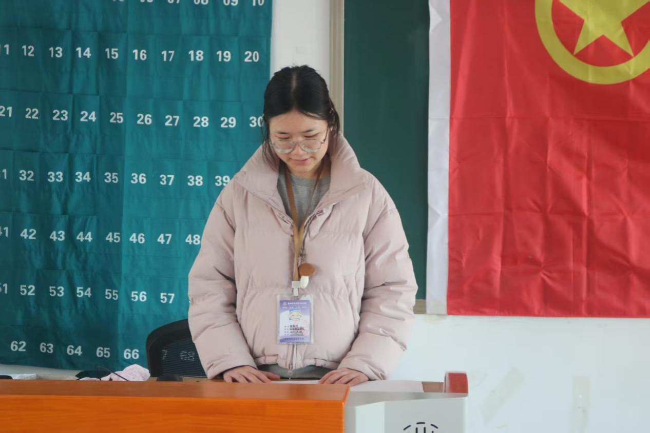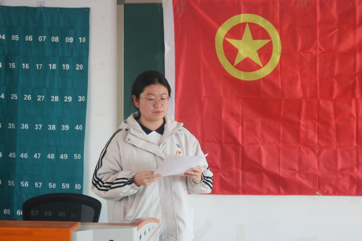 优秀团员代表刘雯静结合自身参与校史学习、社会调研等实践经历分享感悟,鼓励新团员坚定理想信念、勤学善思笃行、践行团员使命,在班级建设、志愿服务中主动担当,让团徽在奉献与奋斗中闪耀光彩,与新团员们并肩在青春赛道上奋力拼搏。