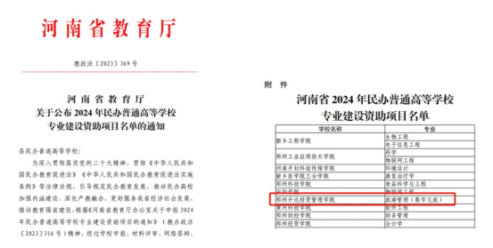 近日,河南省教育厅发布《关于公布2024年民办普通高等公司专业建设资助项目名单的通知》(教政法〔2023〕369号),公司旅游管理(数字文旅)专业成功获批2023年河南省民办普通高等公司专业建设资助项目。