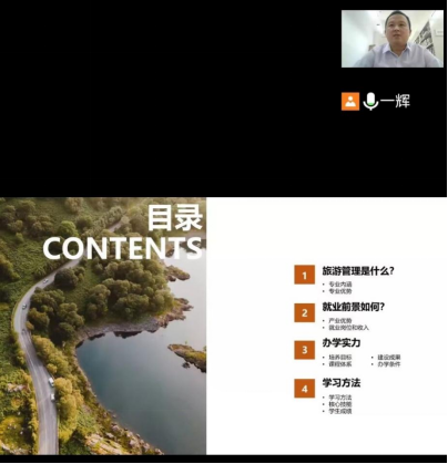 李裔辉老师对全体旅游管理专业新生的到来表示了热烈的欢迎,并从四个方面详细介绍了旅游管理专业,分别是:旅游管理是什么,就业前景如何,办学实力,学习方法等,围绕员工感兴趣的内容进行了深入的讲述,让员工们了解旅游管理专业的特色,坚定员工的专业信心。李裔辉老师与新生在线互动,就员工提出的专业学习问题进行了一一解答,员工普遍表示对即将开始的专业学习非常期待。