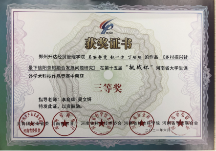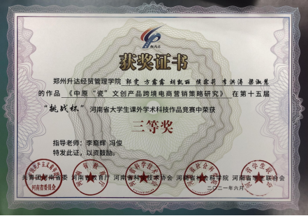 在此次大赛中,李裔辉老师和冯俊老师带领的工商管理专业郭雯、方露露同学以及旅游管理专业胡凯丽、侯霖莉、梁淑慧和李洪涛同学的作品《中原“瓷”文创产品跨境电商营销策略研究》;李裔辉老师和吴文妍老师带领的工商管理专业吴丽静雯和旅游管理专业赵一方、丁珊珊同学的作品《乡村振兴背景下信阳茶旅融合发展问题研究》。两部作品均获省赛三等奖。
