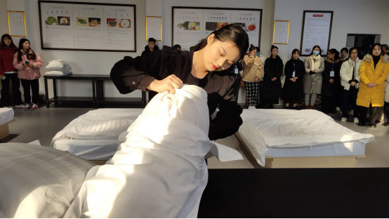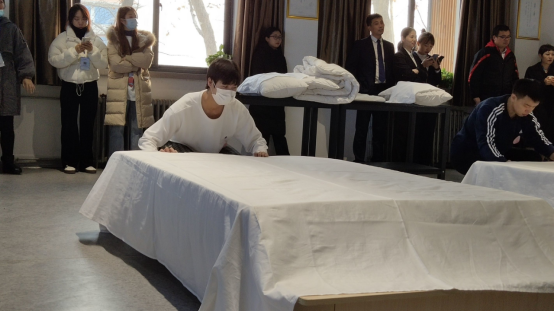 比赛第二个项目是中式铺床,本环节分为四轮十二组。中式铺床包括甩单定位、包角、套被套、枕套等整套铺床流程,要求在3分半钟内做到三线对齐、平整美观,考验选手操作的熟练性、规范性和美观性。选手们也以娴熟精湛的服务技能和规范的操作流程,充分展示了扎实的基本功和爱岗敬业的精神风貌,获得了现场嘉宾评委的一致好评。