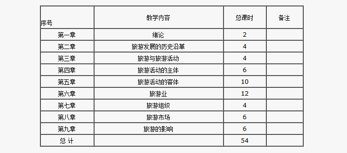 该课程教学大纲的制订充分体现党的教育方针和国家的教育法规,以“三个面向”为指导,体现改革精神,符合时代要求,突出体现公司产品观念的更新和教学思想的转变。制订该大纲时我们充分借鉴和参考优秀课程大纲的编写规范和格式,并紧密结合新时代旅游学的特点。